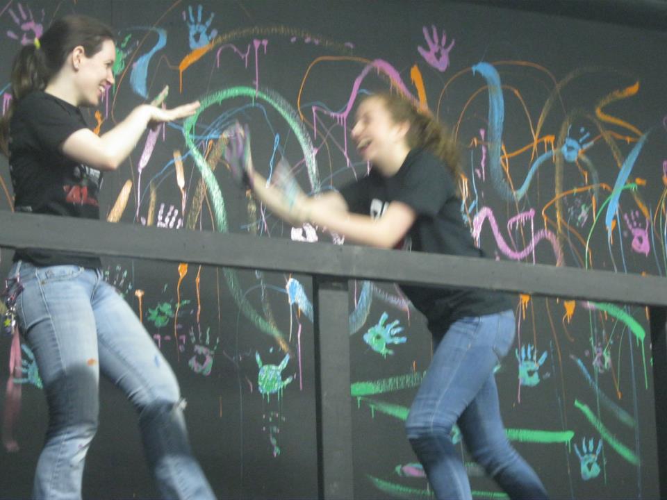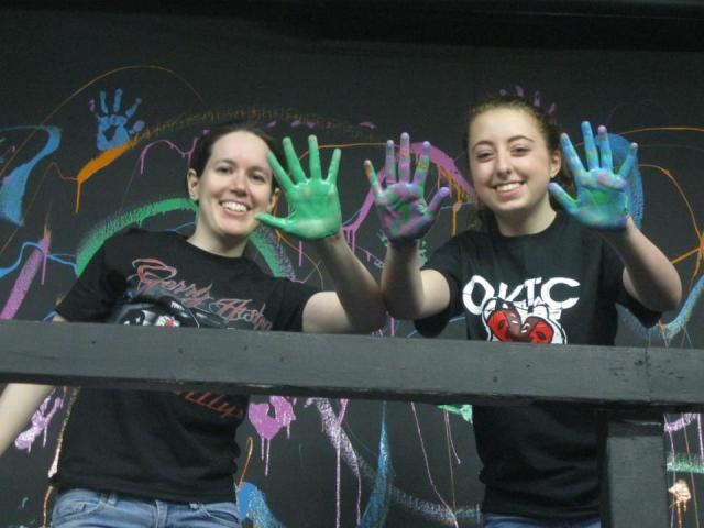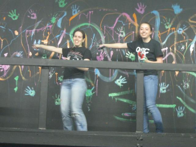 I always say to our new co-op students that “every day is different at OKTC” and today was no exception. Today my co-op students, Dan and Rebecca, and I got to paint the Spriet Theatre for our upcoming production of How to Eat Like a Child. The director’s vision was “make the set look like kids painted it,” and we were happy to oblige!